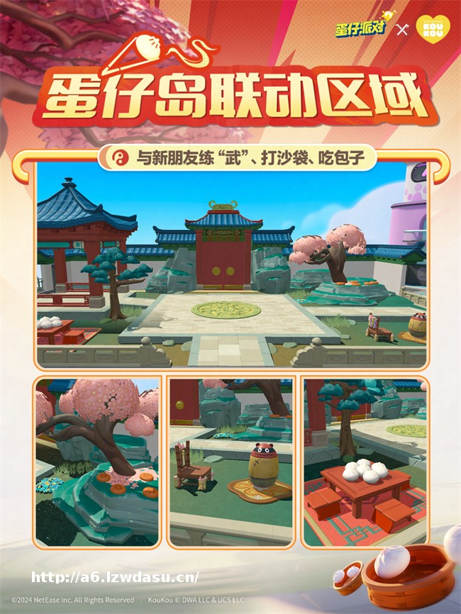 同时,蛋仔岛也将上线联动区域,小蛋仔们可在其中切身体验阿宝和师父的练功日常。小蛋仔们可在区域右上角打坐冥想,梳理武学练功思路,再前往右下角的练功区,将自己的想法于练功不倒翁身上一并付诸于实践。若是练功累了,一旁还准备了满满一桌的豆沙包,欢迎小蛋仔们随时与自己的朋友们一起大快朵颐……