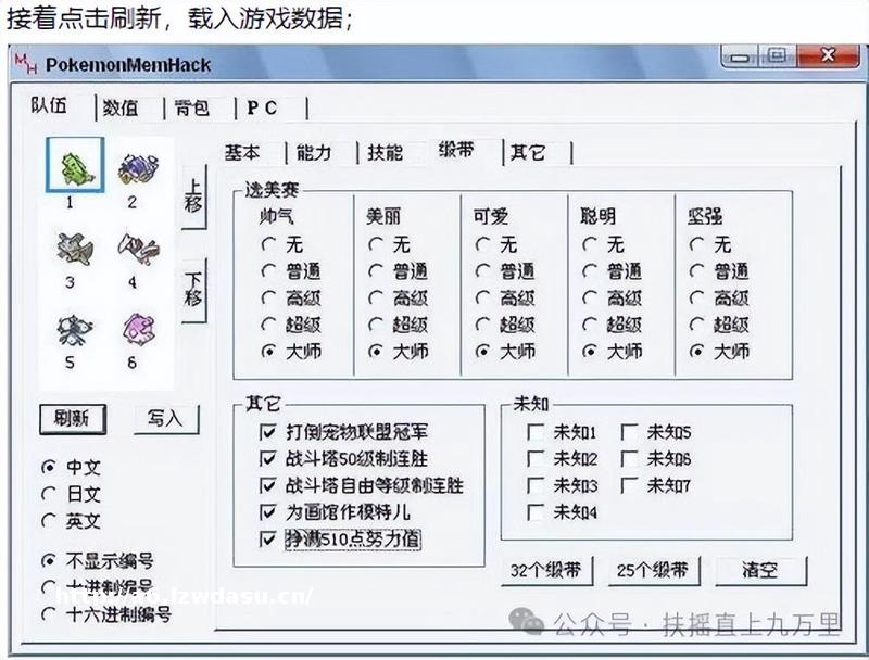 包括基本的种族、*格、手持道具、等级、经验、能力、技能、缎带、宠物球等3、背包道具、数量、现有道具变为50个、宠物球各50个、树果各500个、技能机器各50个等快带生蛋、快速升级、升级为**图签、获得所有勋章、全宠物(386个)等等。