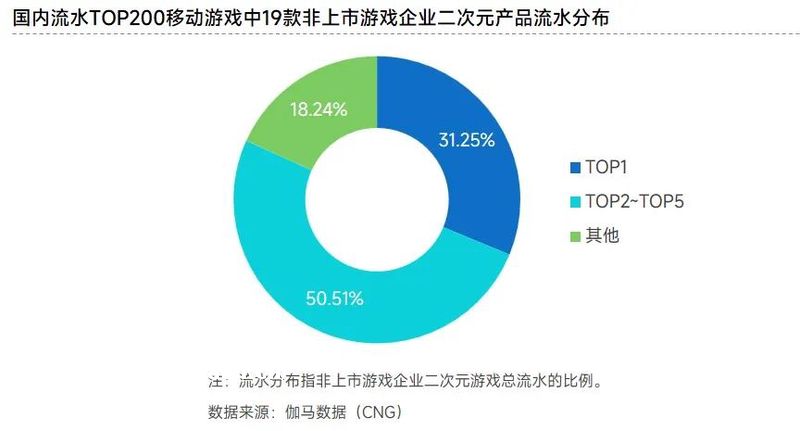 2023年上半年国内流水***200移动游戏有19款非上市游戏企业**的二次元产品,同比增加5款, 二次元产品流水集中于单款产品的现象有所改善,***1产品的流水占比从2022年上半年的59.21%下降至31.25%,***2~***5产品的流水占比由25.04%上升至50.51%。此外,2023年上半年有3款流水较高的二次元新品进入***5。
