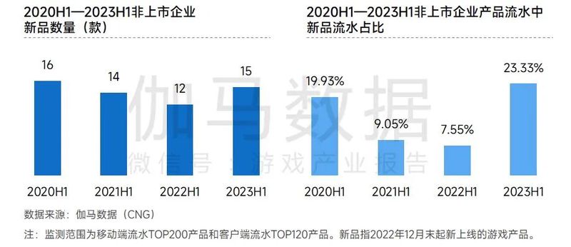 2023年上半年,新品流水大幅回升,同比增长134.1%,为近四年**,超过了2021年的水平。非上市游戏企业共推出了15款新品,同比增加3款。在非上市游戏企业产品流水中,新品流水占比达到23.33%,为近4年新高。由于新品的质量普遍较高,流水占比明显上升。