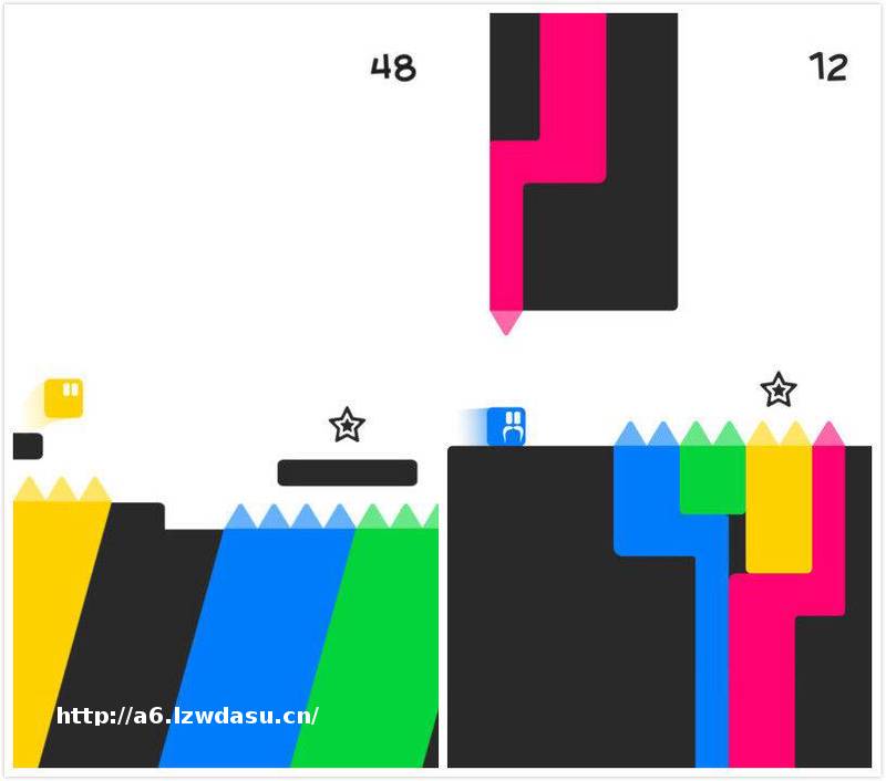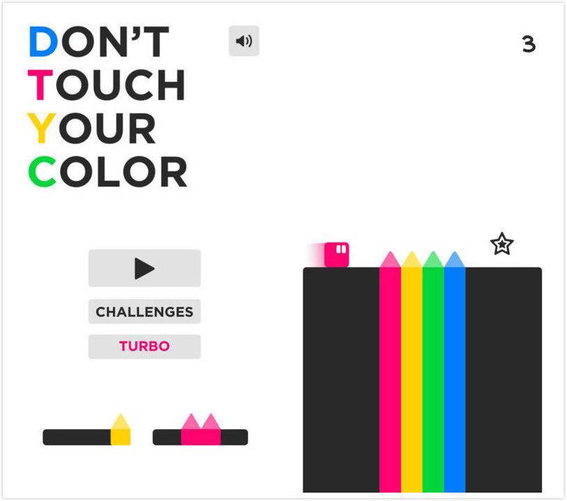 「Don't touch your color」,这就是它的全名,这是另一家游戏厂商 Appsolute Games LLC 开发的小游戏。从名字你就能看出这款游戏的玩法:你要不断在前进的过程中,跳起来躲避和自己颜相同的尖刺障碍,而碰到颜不同的障碍的时候则可以通过。