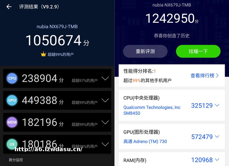 有关全新一代骁龙 8 平台这里就不再赘述了。按照惯例,这里依旧选择安兔兔和鲁**两款软件对红魔 7 做了跑分测试,其中安兔兔跑分为 1050674 分,鲁**为 1242950 分,均属于目前所有我们实测过骁龙 8 Gen 1 手机中**的。可以从另外一个角度说明,它的*能释放相对更激进。