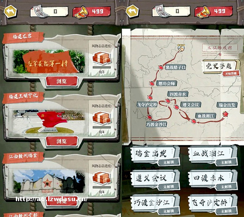 以“瑞金出发”阶段为例,玩家从长汀出发,经宁化、瑞金、于都,行军1400公里到达信丰时,系统会弹出提示,“1934年10月29日至1月1日,我军渡过了信丰河(桃江),突破了敌人的**道**线”,向玩家介绍该地点所对应的历史**。玩家还可以解锁对应章节的问答闯关玩法,答题成功即可获得长征风物志的拼图碎片,更深入了解途径的长征标志*历史人文景观。