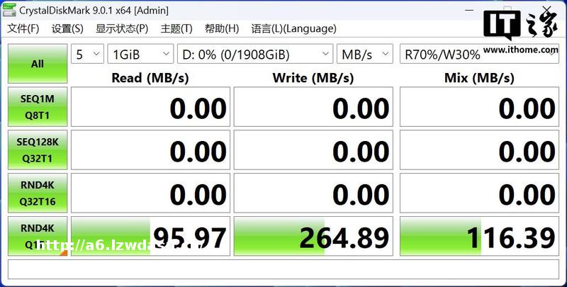 为了进一步探究贴近消费者真实日常的复杂工况,引入了 4K Q1T1 条件下的“七读三写”(70% 读取与 30% 写入)混合负载测试。在实际的系统运行中,诸如启动大型生产力软件、加载 3A 游戏场景或渲染无缝大地图时,硬盘面临的往往不是单纯地持续读写,而是伴随着大量 4KiB 超小文件的并发混合存取,且硬盘需要*其频繁地在读、写两种工作状态间切换。
