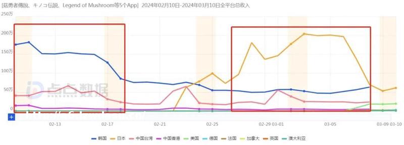 此前游戏出海营收**的韩国市场日流水已经从超过 180 万美元下滑到 60 万美元,只剩下了 1/3。而**市场虽然在 2 月 22 日起量后日流水迅速上涨到 192 万美元的峰值,但随后也迅速下滑,从 3 月 8 日开始下降到 70 万美元以下。在不同市场流水都大幅下降,「菇勇者传说」维持流水高位的能力大概率不如其他头部出海产品。