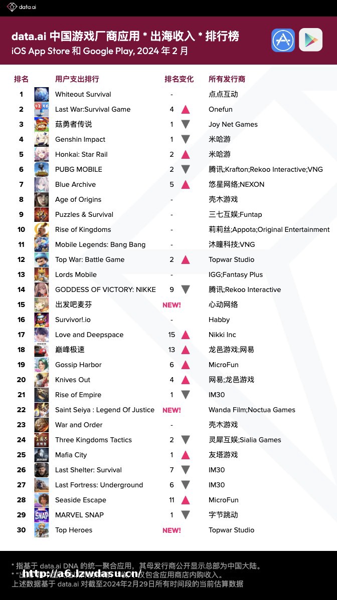 相比之下,国内已经火爆的小游戏,以原生 App 出海,则做出了不错的成绩。不久前,4399 的「菇勇者传说」,在 data.ai 的 2 月出海手游**榜中位居 Top 3,超过了米哈游的「原神」和「崩坏:星穹铁道」。