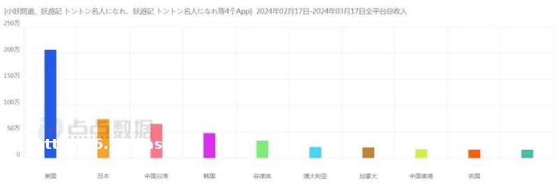 三七的「小妖问道」,在 2023 年 11 月 19 日于美国市场上线,2024 年 1 月开始迅速起量,最近 30 天的美国市场流水更是达到 227.8 万美元,占全球总流水的 41.6%,成为该游戏**的收入市场。
