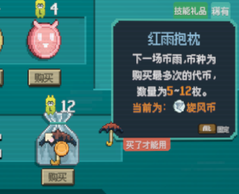 最后再来说挂件,挂件不需在商店中购买,随着回合数的推进(共十回合),玩家可以自主选择,目前游戏里只有六种挂件,分别是存折(将代币保留到下一回合)、花贝(多兑币两次)、生气河豚(扩大礼物范围)、环保袋(增加一个礼物槽)、**摇杆(两次商店免费刷新),其中**用的是环保袋,可以让玩家多拿一个红雨抱枕。值得注意的是,挂件并不直接参与到玩家的构筑当中去,但如果选对可以让玩家的构筑更快成型。
