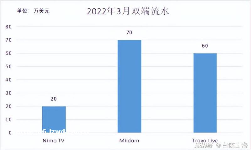 在成为虎牙**股东的 2020 年,腾讯斥资 3000 万美元在海外同步部署了一个类 Twitch 的游戏**平台 Trovo,Trovo 的**站是美国,现在来看,更多放在除美国之外的美洲市场。现阶段 Trovo 的双端月流水大致为 60 万美元,高于 Nimo TV,