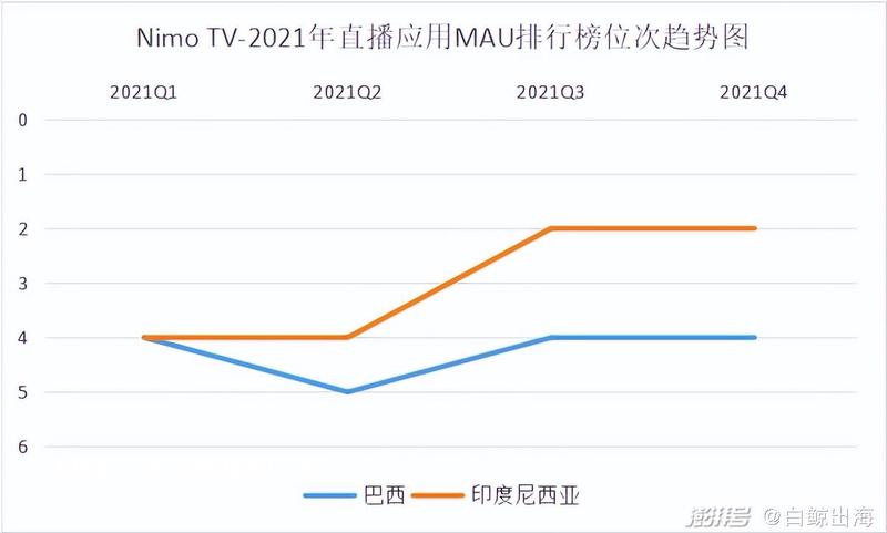 上述财报中重点提及了 Q4 Nimo TV 在印度尼西亚的增长,而从 data.ai 报告来看,同样呈上升趋势,Nimo TV 在 2021 年 Q4 MAU 在印尼位居第二,仅次于 BIGO LIVE,ai)