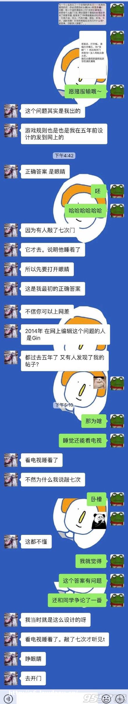和一个小盆友玩了一个幼稚的游戏 如果你猜错的话,你必须把你的头像24小时变成!突然有个人敲门7次.原来是那个青蛙的好朋友带来了惊喜早餐.他带来了7种青蛙最喜欢吃的东西巧克力派,芝士,巧克力糖,面包,炒饭,牛奶,活的苍蝇!你觉得青蛙应该先打开什么呢?