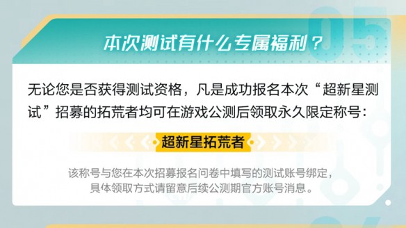 成功报名本次“超新星测试”**的拓荒者,无论获得资格与否,均可在游戏公测后领取**限定称号:“超新星拓荒者”,感谢您的支持!