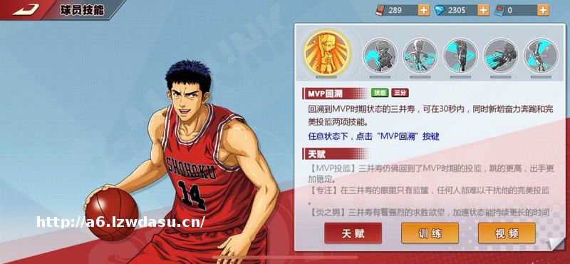 三井寿是《灌篮高手》里神奈川县国中时期的MVP,他也是对着安西教练说出“教练,我想打篮球”的无助少年,他更是涅磐重生后带领湘北一众新人闯进**大赛的外线**。就和原作里的众人一样,大家都在期待三井可以回到最强势的MVP时期。因此在灌篮手游里,三井寿的大招被设计成“MVP回溯”,一旦开启MVP回溯状态,六大进阶天赋齐开,玩家们将见到最鼎盛时期的三井寿!王者归来了!