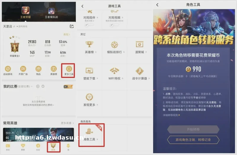 接着,打开王者营地,进入战绩页面,点更多工具,在游戏工具页面下方进入角色工具,就会看到「跨系统角色转移服务」了。