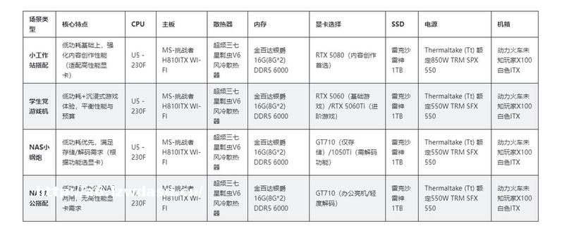 - 电源:Tt TRM **X 550W,299块!**X小电源,刚好塞ITX机箱,额定550W够带RTX5060+U5-230F,稳定得很,不用担心翻车。