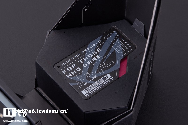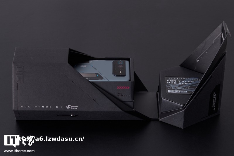 首先看包装,纯黑包装加白视觉元素点缀,很有 ROG 的风格。打开方式依旧为抽拉式,底部的金属质感抽出方向提示扣也有所保留,拉开并提起右侧部分,手机本体就像机甲的驾驶舱被弹出的样子,很有感觉。