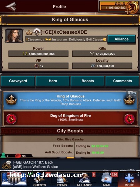 前面说过,《战争游戏》里的王国就是实际上的服务器。设备的系统语言是中文的玩家会被自动分配到#178或#322王国。这段时间里,我也和几个#332中战斗力200亿左右的玩家谈笑风生过(这样的账号投入应该在万元以上)。突然冒出一个3000000000000战斗力的玩家,我感觉自己好像到了《龙珠》世界里。