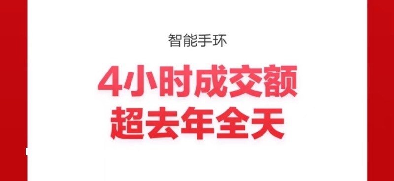 此外,随着大众健康意识的加强,智能手环设备以更便携无感的体验、日渐丰富的功能,打开了大众运动健康的市场的同时,具备监测心率、血氧等功能的更是戳中了用户时刻监控身体状况的刚需,在智能穿戴市场掀起了浪潮。智能手环4小时成交额超去年全天。