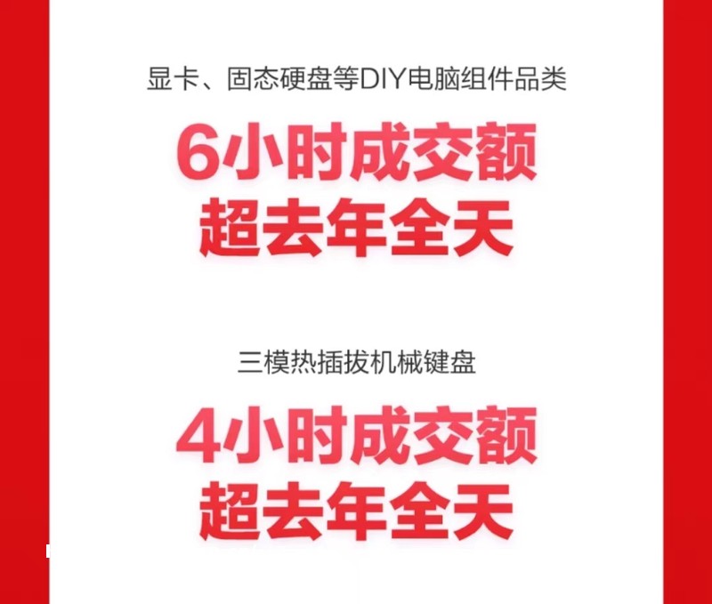 此外,显卡、固态硬盘等DIY电脑组件品类在装备换新升级中迎来销售热潮,6小时成交额超去年全天,三模热插拔机械键盘4小时成交额超去年全天。