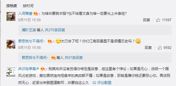 对于游戏方上述的解释,很多玩家并不买账。认为“为啥非要**服?也不给看文身为啥一定要光上半身呢?”“太巧合了吧?你们江南百景图不是很懂历史吗?”“如果是无心,说明一个国风历史游戏,那就是*你钱还要恶心你。再说既然无心,赶紧出来删图**呗,非要拖这么久”