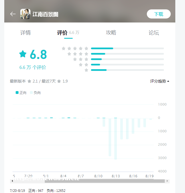 截至目前,《江南百景图》在TapTap上的评分已跌至6.8分,自上述**发酵后,玩家对该游戏的负面评价火速上升,其中8月17日当天,负面评价高达3114条。