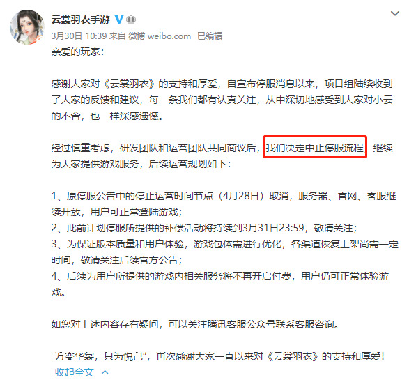 由西山居**、腾讯游戏发行的《云裳羽衣》是一款女*向3D恋爱换装手游。游戏本该在今年6月正式停止运营,但玩家们不满的声音越来越大,同时也开始积*地发起行动。随着中国消费者协会开始介入并跟进此事,游戏中止停服流程,后续为用户所提供的游戏内相关服务将不再开启付费。