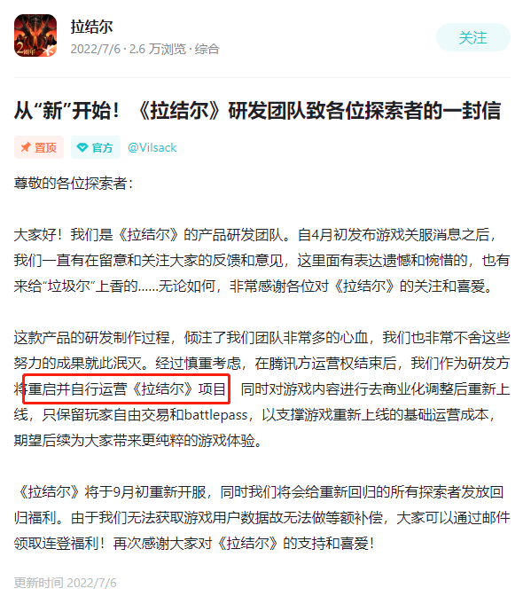 但在停运公告发出不久,《拉结尔》在TapTap上也表示称,腾讯运营权结束之后,**团队将自行运营《拉结尔》项目。同时会对游戏内容进行去商业化调整,只保留玩家自由**和battlepass,以支撑游戏重新上线的基础运营成本。而重新开服的时间也与停服时间几乎无缝衔接。