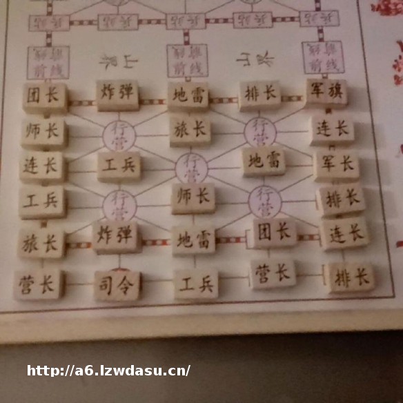 军棋棋盘:行走路线包括铁路线和公路线,每方有5个行营、23个兵站(翻棋25个)、2个大本营。准备好双方不同颜色的棋子。兵站是棋子的摆放位置;铁路线是棋子的快行线,只要在直线上棋子走的步数都不限(除了工兵以外,其他棋子都不许拐弯),公路线是慢行线,每次只能移动一步;行营是棋子的保护区,在行营中的棋子可以免受其他任何棋子的攻击,行营里的棋子每次只能移动一步;大本营其中一个是军旗所在位置,另一个可以摆放其他任何棋子,进入大本营的棋子不能再移动。工兵行棋比较特殊,只要在铁路线上,在没有挡路的情况下,可以拐弯。关于地雷的规则,地雷可以胜工兵外所有有生命的棋子,与**同归于尽。这两种说法在实际战斗中均能说得通。前者,地雷这个棋子可以解释为雷区,一颗雷没了还有别的雷;后者,可以解释为军官趟雷开辟道路。