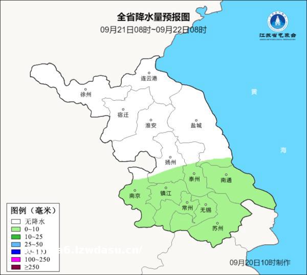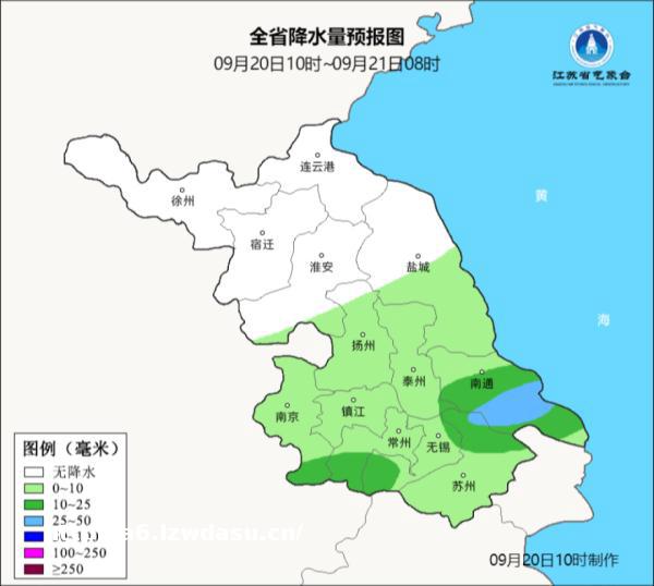 9月20日08时至10月24日08时,本省西北部地区和沿江苏南地区阴有阵雨,其中苏南南部部分地区雨量中等,其他地区多云。