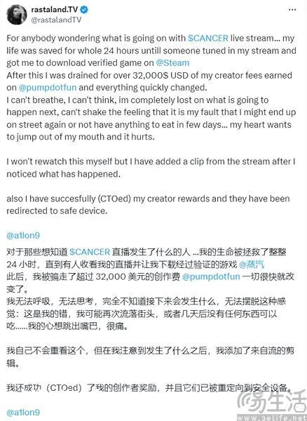 “只是玩了一款游戏,自己的救命钱就不翼而飞”,这不是电影剧本,而是不久前真实发生在海外游戏主播“RastalandTV”身上的遭遇。这位主播在社交平台发文称,他为**用收到的价值超过32000美元加密货捐款,在安装了一款名为《BlockBlasters》的Steam游戏后被盗。