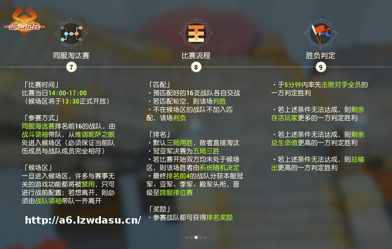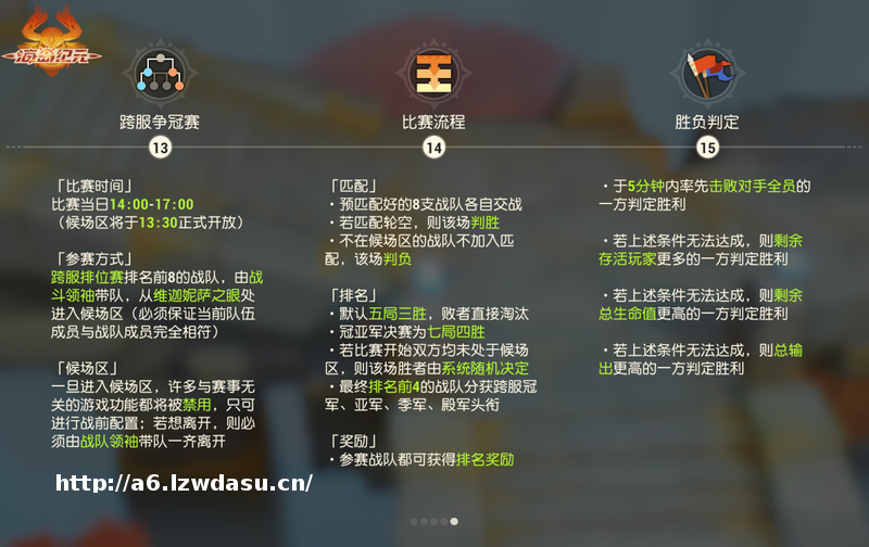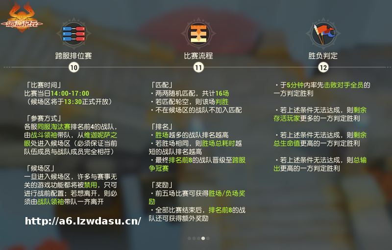 激爽战斗,酣畅一夏!预匹配好的16支战队进入【同服淘汰赛】后,便可各显神通,享受超燃对决。本轮比赛采取三*两胜制决出胜负,败者直接淘汰出*。经过厮杀对决后,留到最后的两支队伍将以五*三胜制决定冠、亚军归属。最终排名前4的战队分别获得本服的冠军、亚军、季军、殿军头衔,而后晋级到【跨服排位赛】。