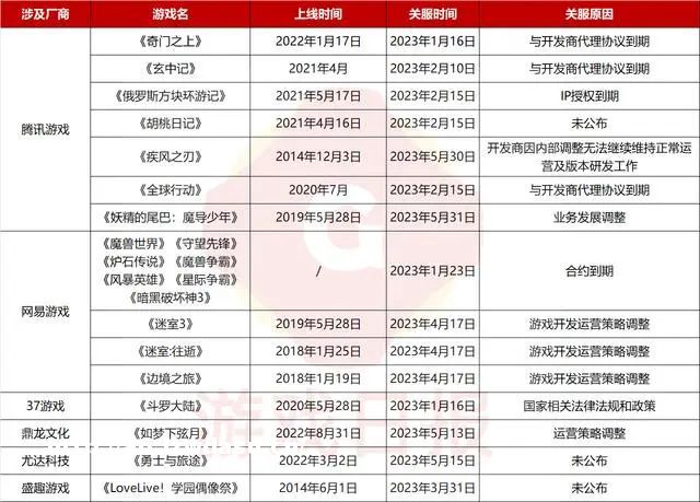 2023年Q1季度国内超过21款游戏关服停运,其中近半为IP游戏。即使抛开网易与暴雪“离婚**”影响的《魔兽世界》《暗黑破坏神》等,37游戏《斗罗大陆》腾讯《妖精的尾巴:魔导少年》都是国内外头部IP**。