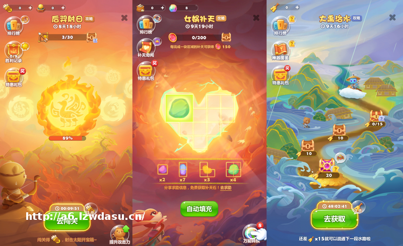 其中,后羿射日玩法需要玩家收集并利用弓箭将天上悬挂的太阳逐一击落;女娲补天玩法需玩家收集并利用五彩石将天上的窟窿补齐;而大禹治水玩法则需要玩家通过收集治水**耒耜,