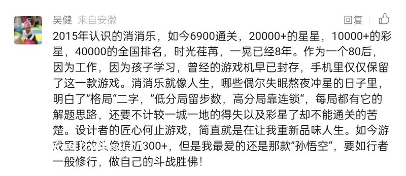 除了上述的阿姨,比如一位来自安徽名叫@吴健 的消消乐用户表示,《开心消消乐》不仅是一款消除类游戏,更是让他持续感悟人生,获取正能量的“**”。