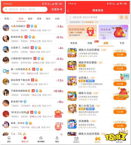 赏帮游戏平台上的游戏任务奖励,一般是和等级、关卡等数值相关,在游戏里达到某个数值要求就可以领奖励(*钱)。在这个平台的【更多】版块就是各种游戏任务分区,玩家选择一款奖励不错的游戏,就可以直接领到任务收入。此外,这个平台还有很多别的任务,比如在任务大厅中的悬赏类任务,这些任务大多数都比游戏任务简单,并且有一部分任务的收益也比游戏任务多,只有数量达到了,是可以稳定达到一天100~200元的,