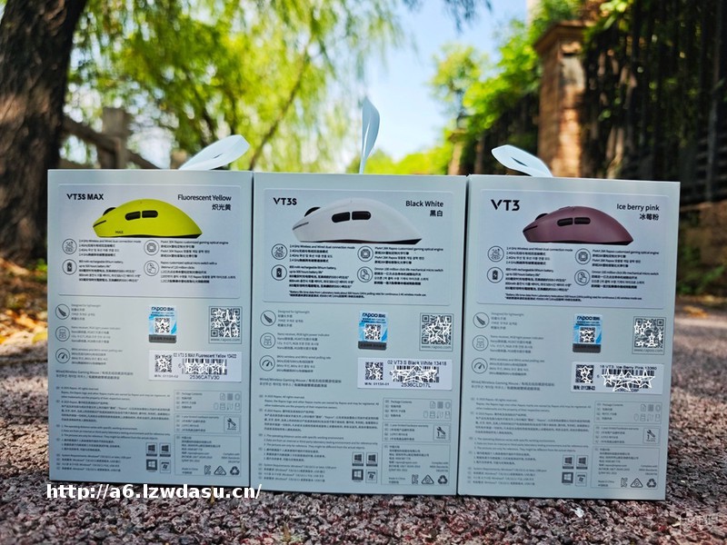背部的位置有产品的相关信息。在此说明下由左到右分别是:VT3sMAX(炽光黄)、VT3s(黑白)、VT3(冰莓粉)。