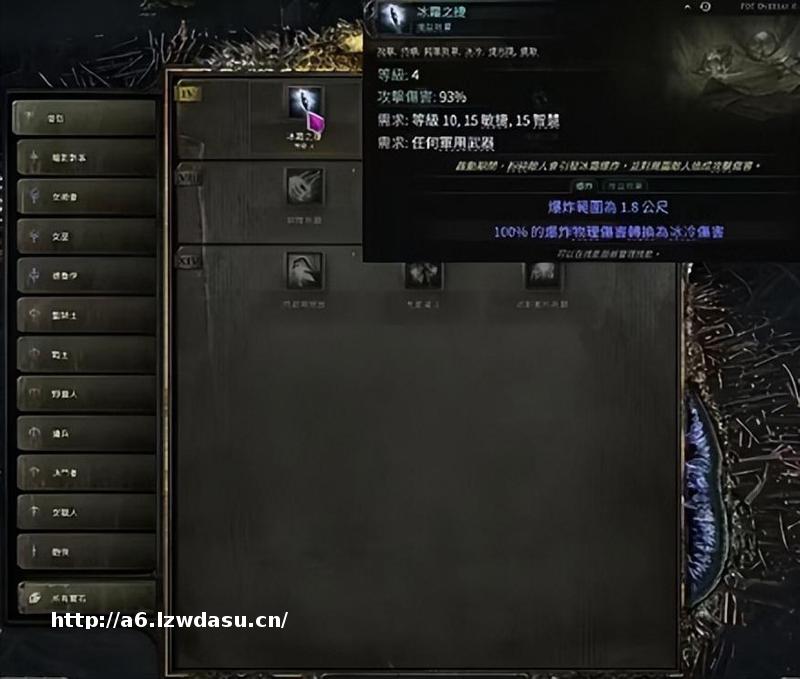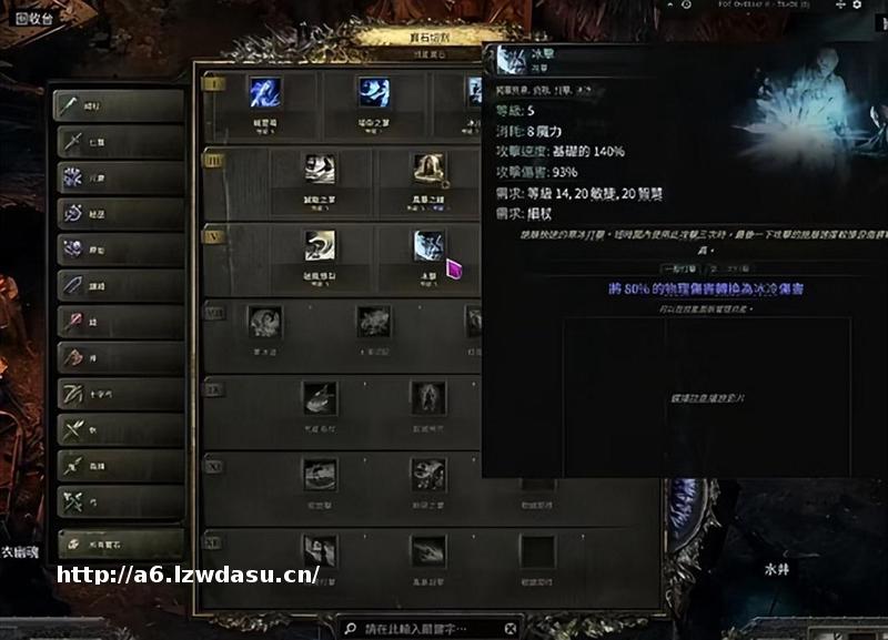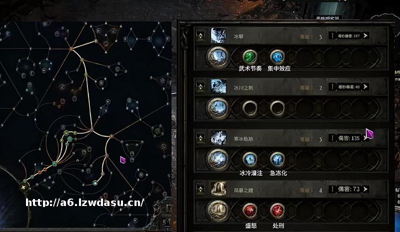 技能宝石对于我们尤为重要,**宝石用来学习风暴之钟,因为是多钟流的打法,所以在狼王之前我们需要学习最少三个风暴之中四个是*限。四级技能宝石优先升级寒冰轨迹,这样我们在11级进入弗里索恩就可以快速的清理怪物。