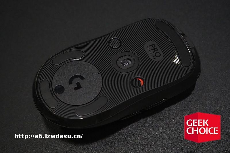 罗技 G PRO 底部表面拥有同心圆的纹路,电源开关在传感器右侧,DPI 调节按键则被放置在了传感器左侧,相比于放在顶部中间,DPI 按键放在底部能够一定程度上防止误触,有得必有失,如果用户像快速调整 DPI 的话,也必须要把手表拿起来。