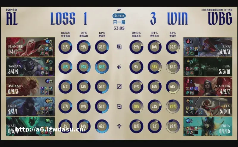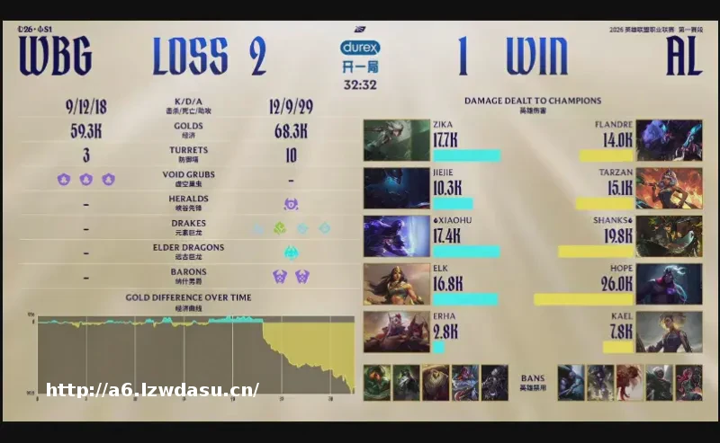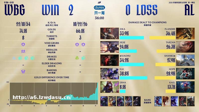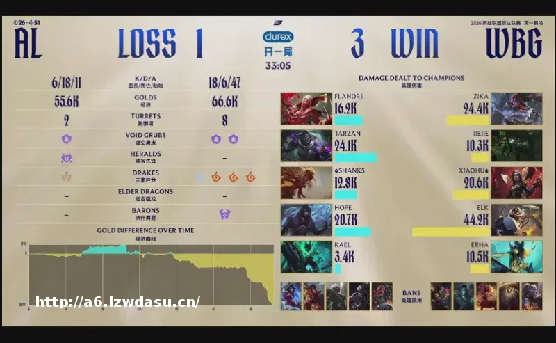 结果***比赛,两队拼尽全力,经济几经波折,WBG笑到最后就。2分钟,皇子直接来下击杀扇子妈;6分钟,两边河道交锋,;21分钟,AL拿下小龙后WBG选择追击,但中野纷纷阵亡,后续AL拿下;23分钟,AL拿下大龙后沙皇在边线阵亡;26分钟,小龙团再次交锋,AL打出2换3随后各自拉开;27分钟, WBG击杀AL下野,随后拿到小龙;31分钟,Jiejie突施冷箭抢龙成功,WBG团战大获全胜;最终34分05秒,WBG拿下龙魂随后顺利一波