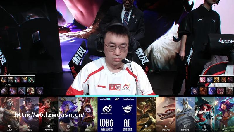 第二*比赛,WBG蓝方,禁用:发条、兔子、韦鲁斯、飞机、卡莎,选用:Zika亚恒、Jiejie、Xioahu乌鸦、Elk芸阿娜、Erha露露;AL红方,禁用:狼母、蔚、岩雀狐狸,选用:Flandre鳄鱼、Tarzan狼狗加里奥、Hope女枪、Kael妮蔻