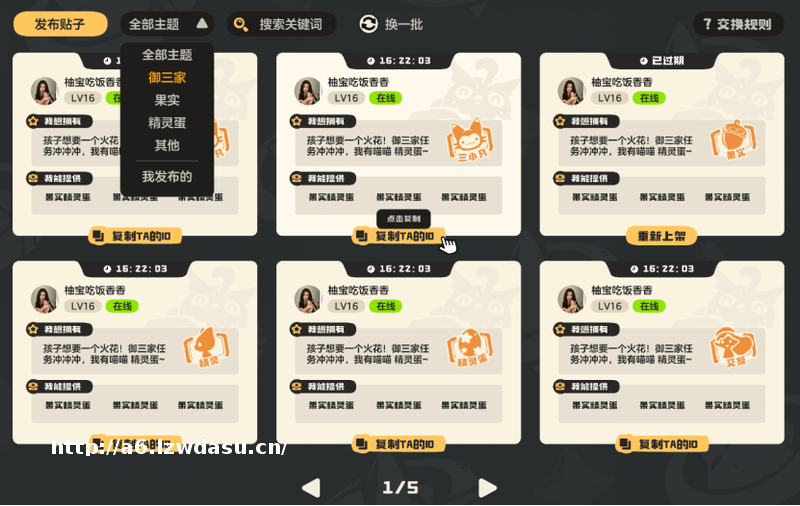 玩家可以在这里自由发布自己的**需求,与其他玩家进行精准**。**大厅让“需求”与“供给”**对接,无论是想补全图鉴的收集*,还是急需特定精灵的养成玩家,都能在这里找到合适的**对象。这一功能不仅提升了收集效率,也让精灵**变得更加可控、更加透明。