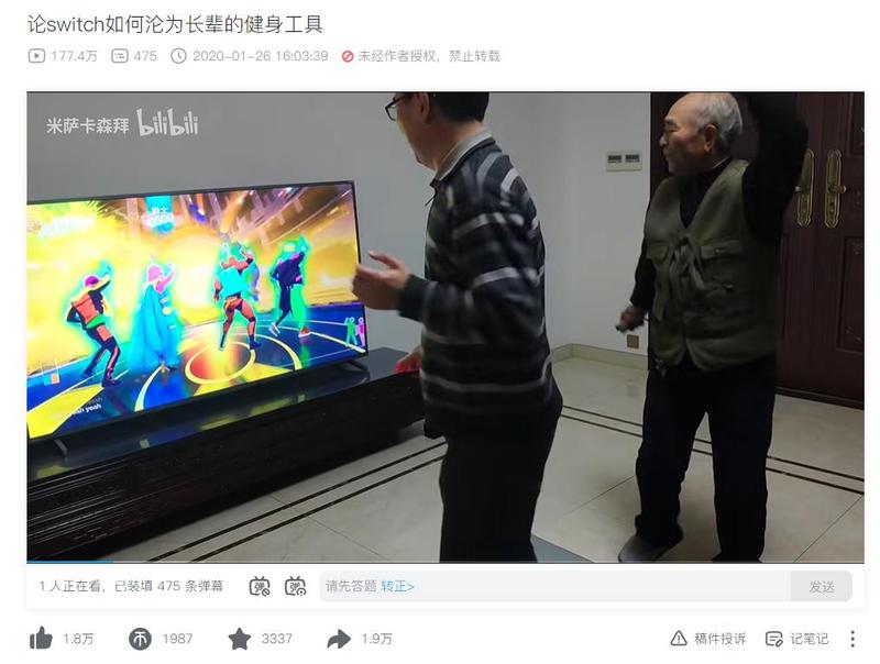 父亲和爷爷一起尝试Switch的体感游戏《舞力全开》,其乐融融。这条短短3分多钟的视频,收获了177.4万的播放量。希望能带自己的长辈也跳起来,让长辈们理解自己玩游戏的乐趣。