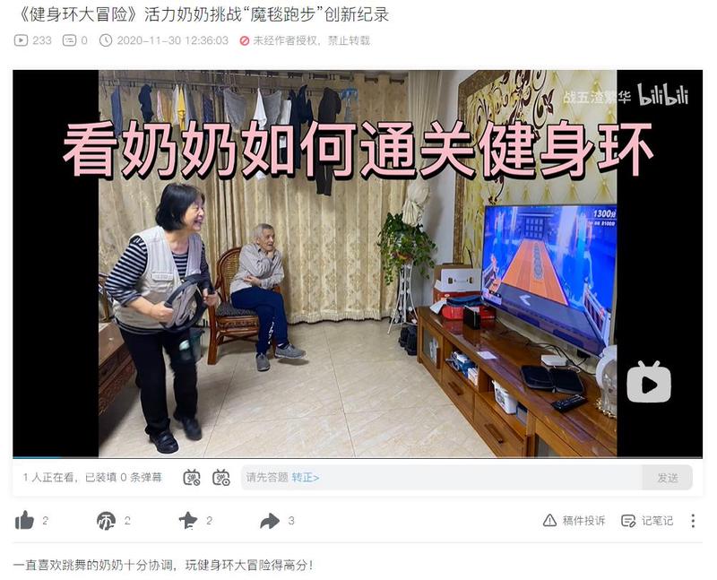 而在另一位up主“花胖子Bella”的视频中,爱跳舞的奶奶在《健身环大冒险》中创下高分记录,爷爷在一旁看得津津有味,并在另一段视频中尝试了一番。