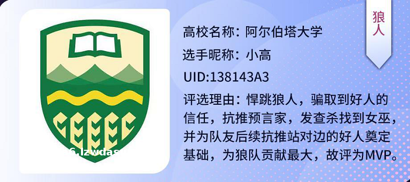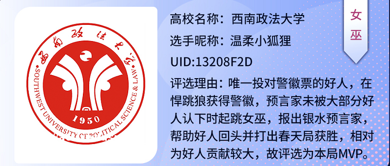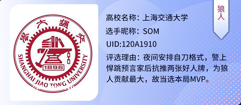 在上周的对战中,来自海内外的各大高校的学子都使出了浑身解数,为大家带来了一场又一场精彩的狼人杀对*。来自上海交通大学的选手SOM以精准的预判能力率先在夜间安排好狼人自刀,随后起跳预言家做高自己身份,精准谋划现场*势,顺利带领狼队取得了游戏胜利,同时他也替上海交大斩获了本次高校夏季赛的**MVP荣誉!