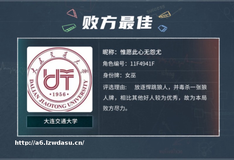 来自冠**伍的选手“惟愿此心无怨尤”,在比赛中不仅成功放逐狼人,还直接*杀一张狼人牌,虽然好人阵营最终失利,但表现优异的他直接成为了败方**选手。