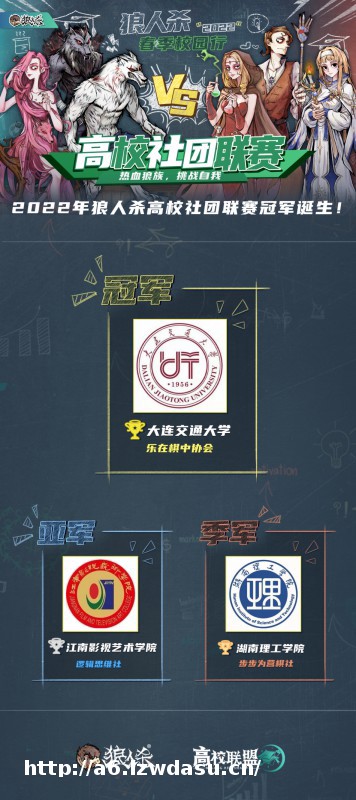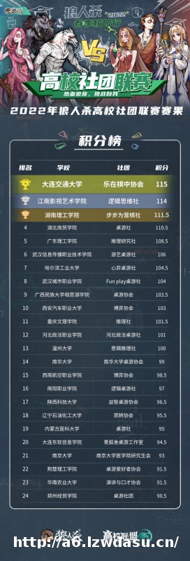2022狼人杀高校社团联赛已经全部结束,但各大高校中的狼人杀游戏生活仍在继续中,想要加入狼人杀高校社团联赛的小伙伴可以申请**加入“狼人杀高校联盟”,还能解锁更多校园主题活动,让我们明年再战!