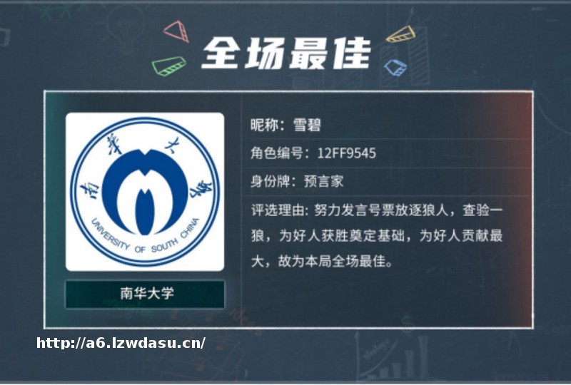 在此前的比赛对*中,来自南华大学的选手“雪碧”,全程努力**号票放逐狼人,同时成功查验出狼人,为好人获胜奠定了基础,并获得了当*比赛的全场**。