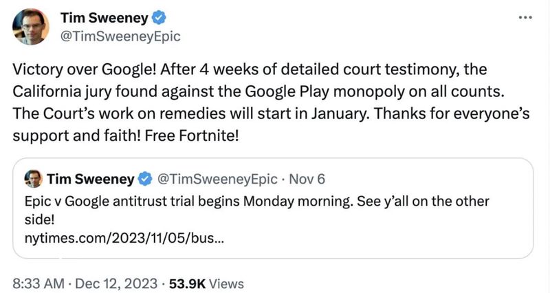 Epic诉谷歌案的陪审团刚刚做出裁决,认为谷歌将Google Play应用商店和 Google Play计费服务变成了非法**。