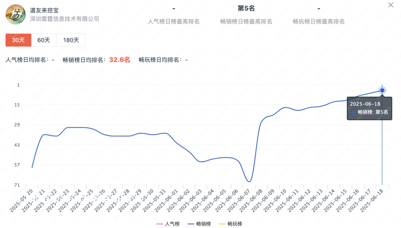 小游戏端投放少;从投放量来看,《道友来挖宝》基本没有投放素材,但却能攀升至微小**榜***5,这表明,这款小游戏并不依托于买量来获量,更多是来汲取《问道》端游、手游的用户。