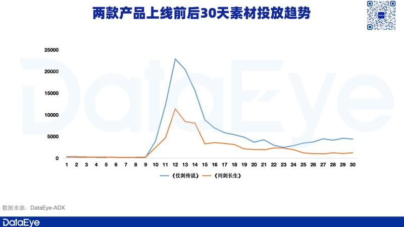 从投放趋势来看,《杖剑传说》上线当天投放了超两万组素材,《问剑长生》则投放了超万组素材,且上线后的素材投放量都处于下滑趋势。相对而言,《道友来挖宝》则倾斜的资源较少,日均素材投放量维持在三位数的区间。